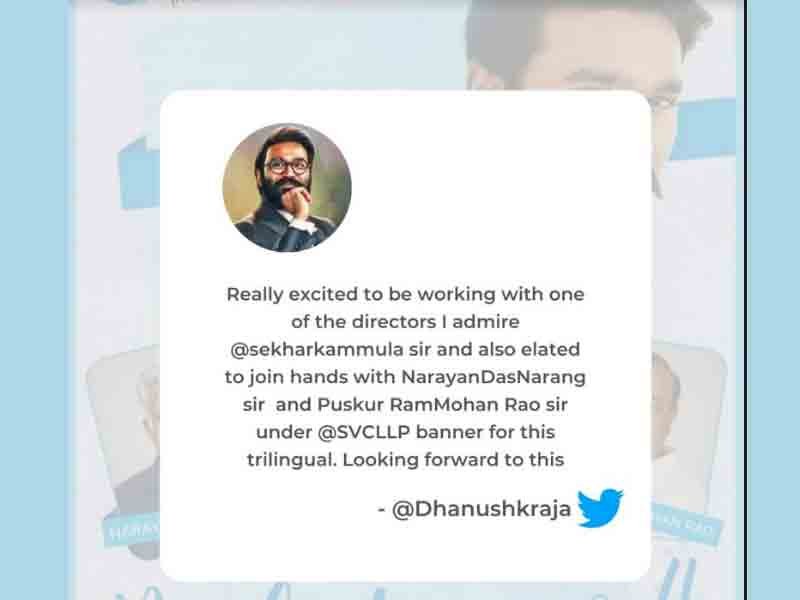`నేను ఎంతో ఇష్టపడే దర్శకుల్లో ఒకరైన శేఖర్ కమ్ముల గారితో కలిసి వర్క్ చేయబోతున్నందుకు చాలా ఆనందంగా ఉంది. అలాగే ఈ త్రిభాషా కోసం ఎస్విసి ఎల్ఎల్పి బ్యానర్లో నారాయణ దాస్ నారంగ్ సర్ మరియు పుస్కూరు రామ్మోహన్ రావు సర్ తో కలిసి పని చేయడం సంతోషంగా ఉంది. ఈ ప్రాజెక్ట్ కోసం ఎదురుచూస్తున్నాను“ అని ధనుష్ ట్వీట్ చేశారు.