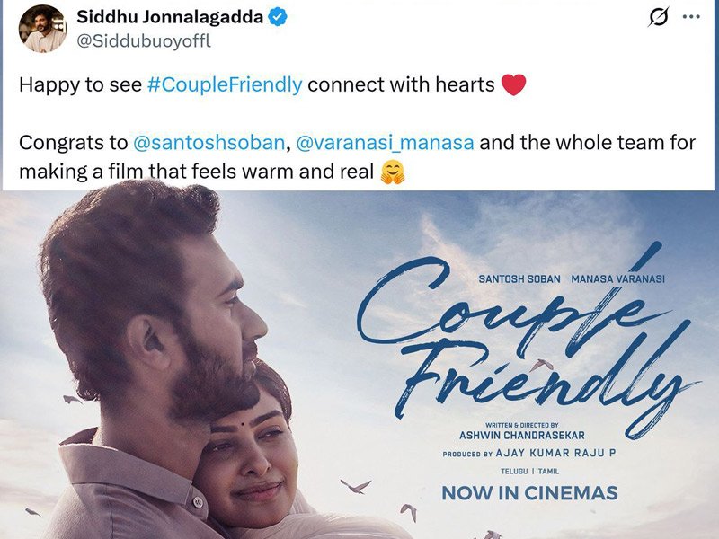 సంతోష్ శోభన్, మానస వారణాసి జంటగా నటించిన “కపుల్ ఫ్రెండ్లీ” మూవీ ప్రేక్షకుల ముందుకొచ్చి మంచి విజయాన్ని సాధించింది. ఈ సినిమాపై ప్రశంసలు కురిపిస్తూ సోషల్ మీడియా పోస్ట్ చేశారు స్టార్ బాయ్ సిద్ధు జొన్నలగడ్డ. “కపుల్ ఫ్రెండ్లీ” సినిమాకు ప్రేక్షకులకు బాగా కనెక్ట్ అవుతున్నారని, ఇది మనసుకు హత్తుకునే ప్రేమ కథా చిత్రమని తన పోస్ట్ లో సిద్ధు పేర్కొన్నారు. హీరో సంతోష్ శోభన్, హీరోయిన్ మానస వారణాసితో పాటు ఇతర టీమ్ మెంబర్స్ అందరికీ తన శుభాకాంక్షలు తెలిపారు.