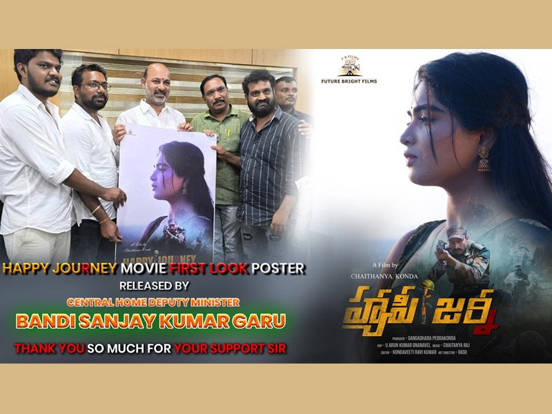 ఫ్యూచర్ బ్రైట్ ఫిలిమ్స్ పతాకంపై హరిప్రసాద్ కోనే, ఇషాని గోష్ హీరో హీరోయిన్లుగా చైతన్య కొండా దర్శకత్వంలో గంగాధర్ పెద్ద కొండ నిర్మించిన ఎమోషనల్ ఎంటర్టైనర్ హ్యాపీ జర్నీ. ప్రస్తుతం షూటింగ్ పూర్తి చేసుకుని పోస్ట్ పర్సెంట్ కార్యక్రమాల్లో బిజీగా ఉన్న ఈ చిత్రం ఫస్ట్ లుక్ పోస్టర్ను కేంద్ర మంత్రివర్యులు బండి సంజయ్ నేడు ఆవిష్కరించారు. ఈ కార్యక్రమంలో చిత్ర దర్శకులు చైతన్య కొండ, నిర్మాత గంగాధర్ పెద్ద కొండ, కెమెరామెన్ అరుణ్ కుమార్ , సీనియర్ జర్నలిస్ట్ లక్ష్మీనారాయణ తదితరులు పాల్గొన్నారు