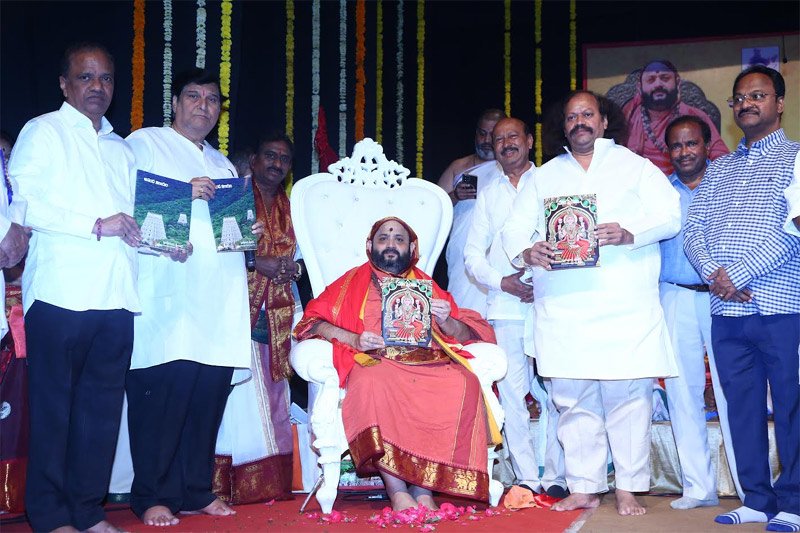 క్రమపాఠీలు, ఘనపాఠీలు, సలక్షణ ఘనపాఠీలు… ఇలా ఎందరో వేదనిధుల్లాంటి వందకు పైగా వివిధ ఆలయాల, వివిధ వేద పాఠశాలల వేదపండితులు రవీంద్ర భారతిలో చేసిన వేదగానంతో ఆ ప్రాంతమంతా పవిత్రంగా ప్రతిధ్వనించడం ఒక అద్భుతమైతే.. ఈ శ్రీ కార్యంలో ప్రముఖ రచయిత, శ్రీశైల దేవస్థానం పూర్వ ప్రత్యేక సలహాదారులు పురాణపండ శ్రీనివాస్ అపురూప రచనా సంకలనాలు ‘దేవీం స్మరామి’, ‘ఆనంద నిలయం’ రెండింటినీ ప్రసన్న మూర్తులైన తేజశ్శాలి, తరతరాల సంప్రదాయ సంస్కృతీ పరిరక్షణ పీఠమైన పుష్పగిరి పీఠాధీశ్వరులు శ్రీ శంకరభారతీ నృసింహ స్వామి ఆవిష్కరించడం మరొక అత్యద్భుత ఘట్టంగా చెప్పక తప్పదు.